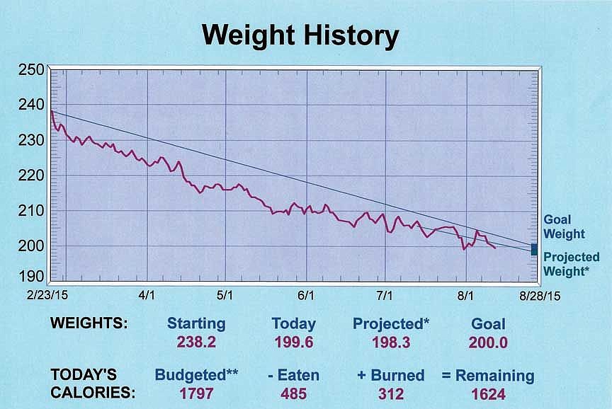 After entering my weight on Feb. 23 and entering my goal, the program set a budgeted daily calorie count. If I ate 1,797 calories a day, my weight would be 200 on Aug. 28. DietPower drew a straight line from the beginning weight to the stated goal weight. I was determined to stay below the line.