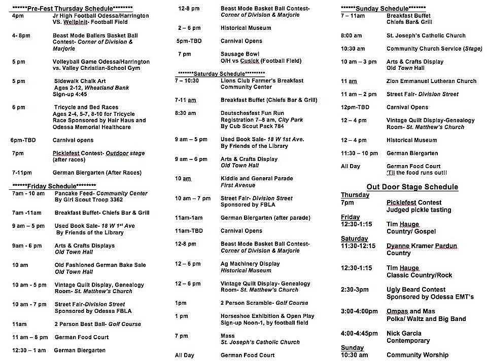 Saturday features a full day of events, including an arts and crafts display at Old Town Hall, the Odessa High School vendor street fair, and a horseshoe tournament at the east end of Finney Field.