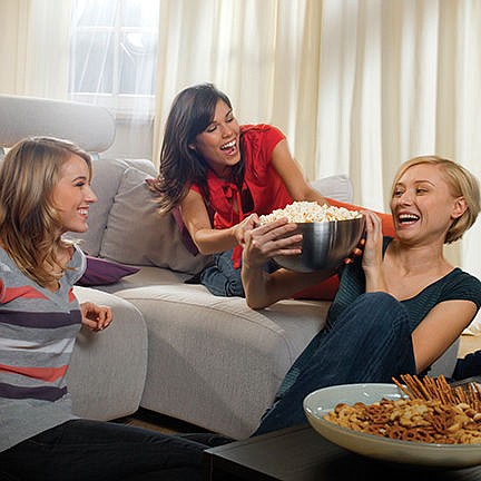 Sweet seats. Be sure guests are ready to get cozy for an extended stay with comfy seating for all. If couch and chair space is at a premium, add plush pillows and blankets to make floor seating a lavish experience. In tight quarters, you can also consider adding a viewing screen in a second room, such as the kitchen, where guests are likely to congregate over refreshments.