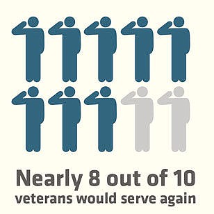 Veterans believe their service had a positive impact on their life. In fact, 79 percent said they would "do it all over again." However, the survey findings also reveal that only 1 in 5 veterans feels the government treats them well.
