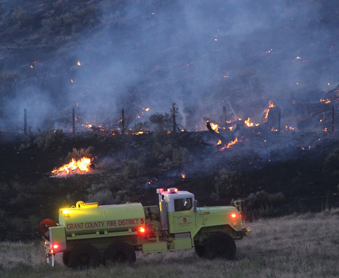 Firefighters with Grant County Fire District No. 5 were dispatched to the fire, which was located in a field behind a home on Harrington Lane Northeast about 8:30 p.m. High winds caused the fire to spread uphill toward Airway Drive Northeast, just below the Grant County Fairgrounds. Police blocked off Airway Drive from Hillcrest Drive Northeast to West Valley Road as firefighters attempted to contain the blaze.