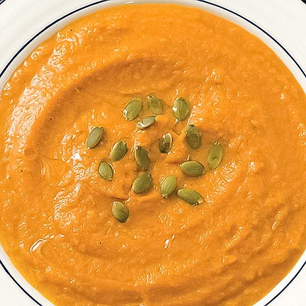 - Transfer to blender or food processor and puree until very smooth. Return to pan and stir in pumpkin, coconut milk and salt. Cook over medium-low heat until heated through, 2-3 minutes.