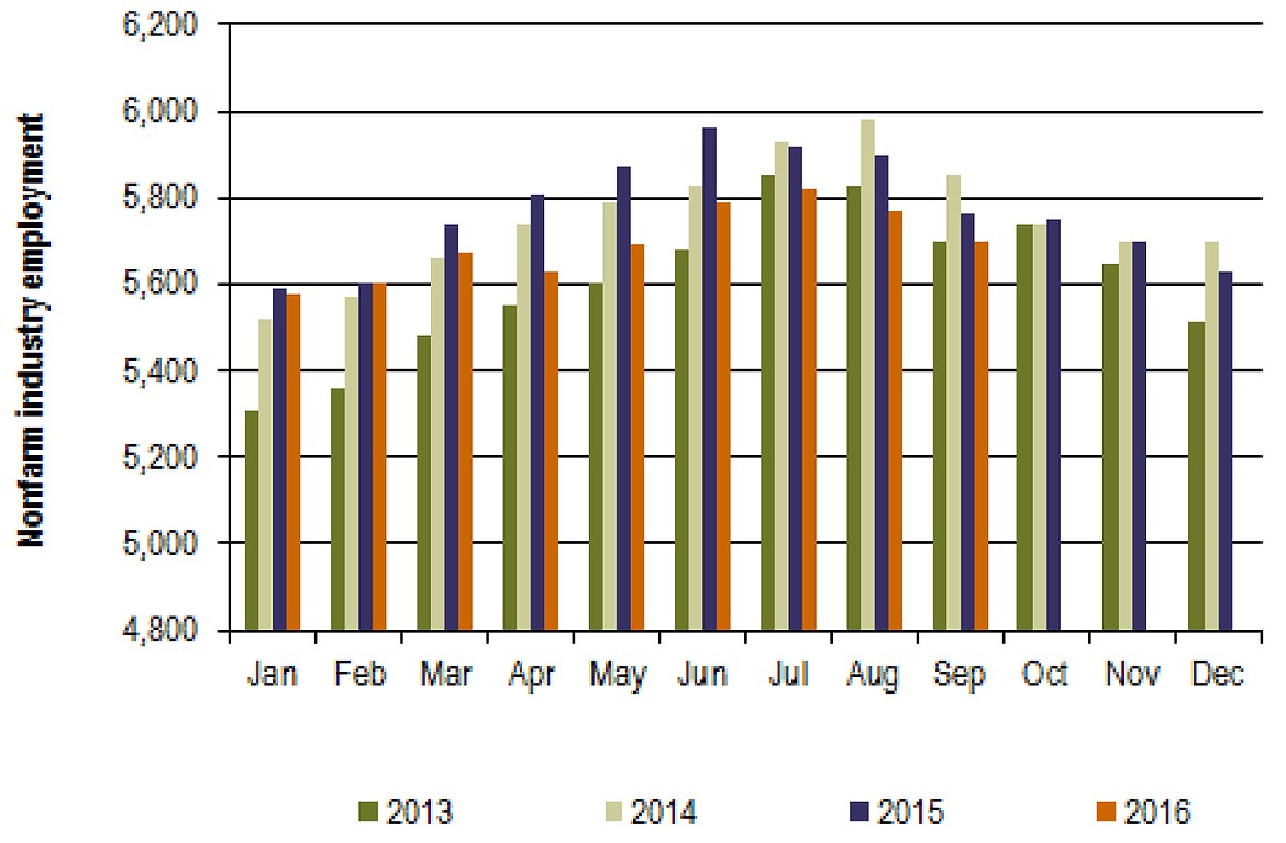 The leisure and hospitality sector lost 10 jobs between August and September, and lost 10 jobs when compared with September 2015.