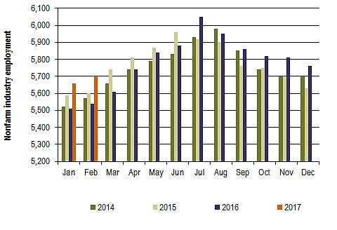 Year over year, employment in the retail trade sector has increased for the past 11 months, April 2016 to February 2017, Meseck said. Between the Februaries, retail trade added 20 jobs, a 3.3 percent increase.