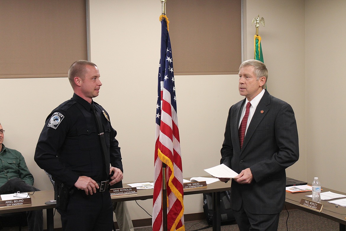 As he prepared to swear in Isaiah Graham, who comes to the Quincy Police Department from a stint as a police officer in Seattle, Larson said he takes the oath very seriously, that it is a creed lived out in every moment of a police officer’s life.
