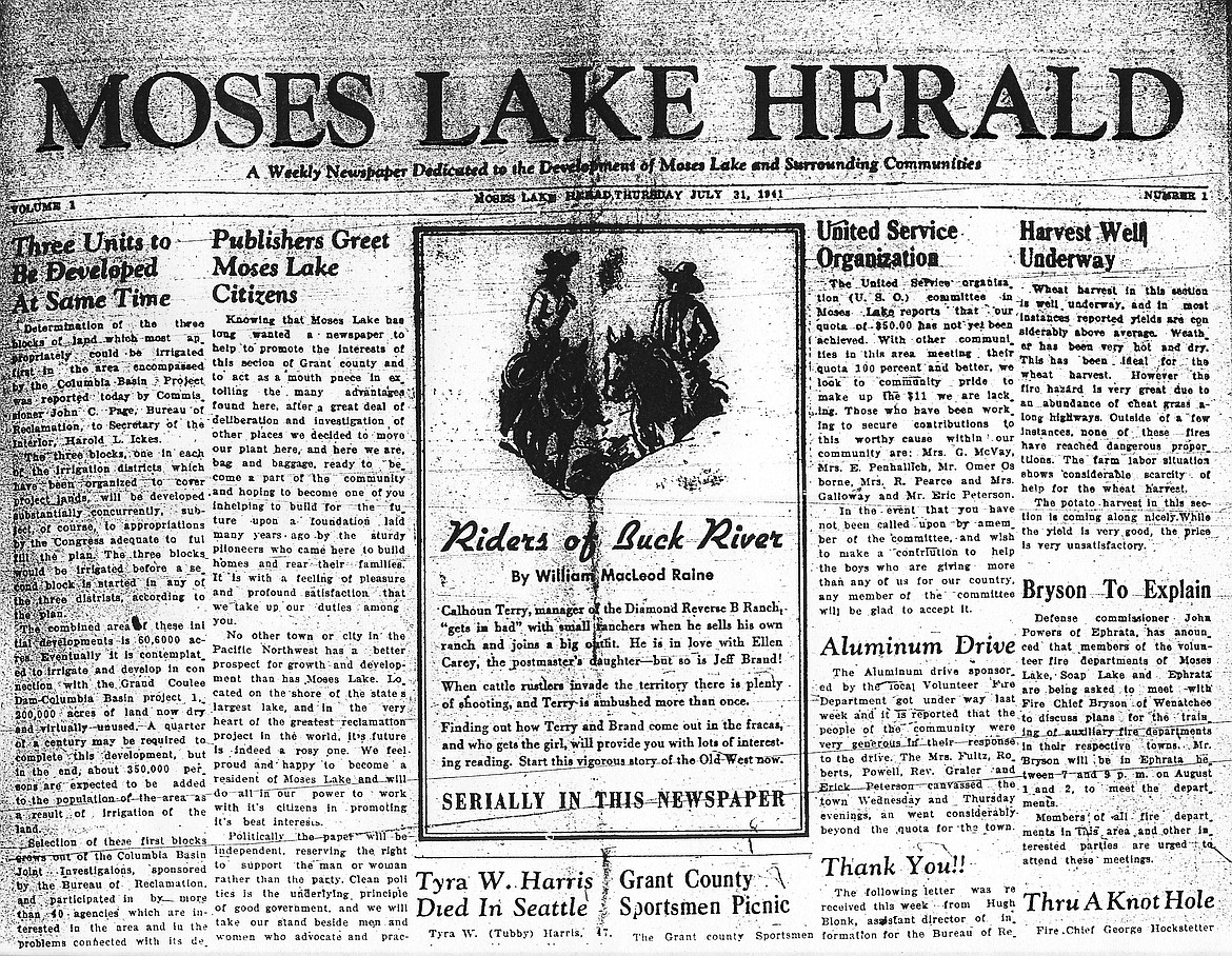 The first Moses Lake newspaper was the Moses Lake Herald, first published on July 31, 1941. Note the Volume 1, on the left side, and the Number 1, on the right side of this first front page.