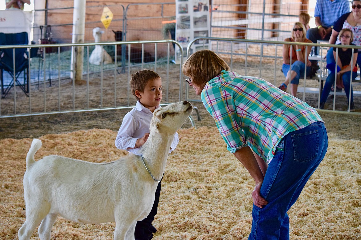 As she speaks, her 5-year-old nephew A.J. Sandoval shows off a goat named Applejack. As the judge, Tammy Long, who raises goats herself in Clarkston, Wash., bends over to talk to A.J., Applejack — a Boer cross with tiny ears — stretches its neck up to the judge.