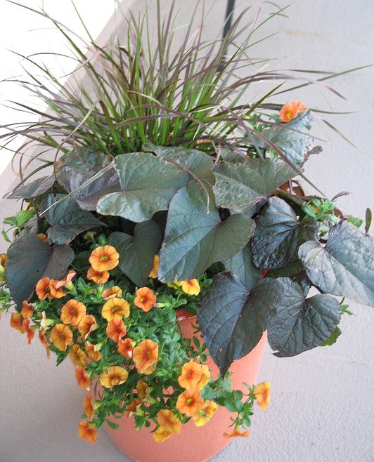 A favorite planting tip is to angle some plants slightly so they’ll spill over the edge of the container. Even plants that aren’t really spillers can soften the edge of the container. It’s ok to pack plants tightly into a container; that will give you the rich, full look you’re going for. When squeezing plants into a small place; be careful not to break roots way from the crown.