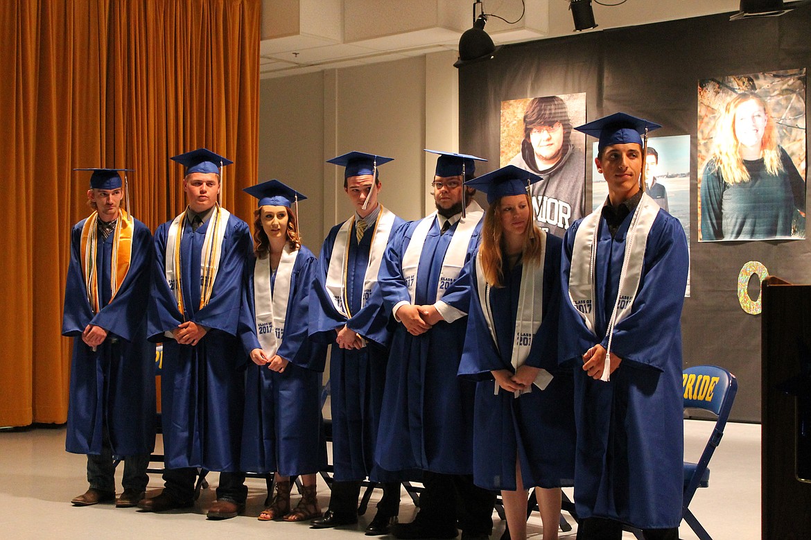 Joining Bise on the stage Saturday morning were valedictorian Chance Garrett, Jessica Gray, Samuel Hochstatter, Colby Miller, Rhianna Skidmore, and Colton Minoletti — the entire Wilson Creek School class of 2017.