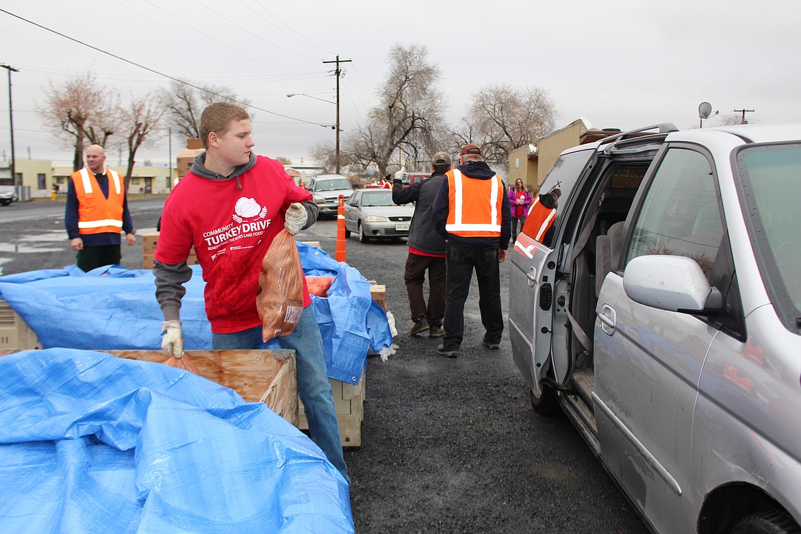 MOSES LAKE — It was a rainy, soggy, cloudy Monday morning, but the volunteers manning the Thanksgiving basket drive-through at the Moses Lake Food Bank didn’t mind. There was plenty of goodwill going around to counteract the bad weather.