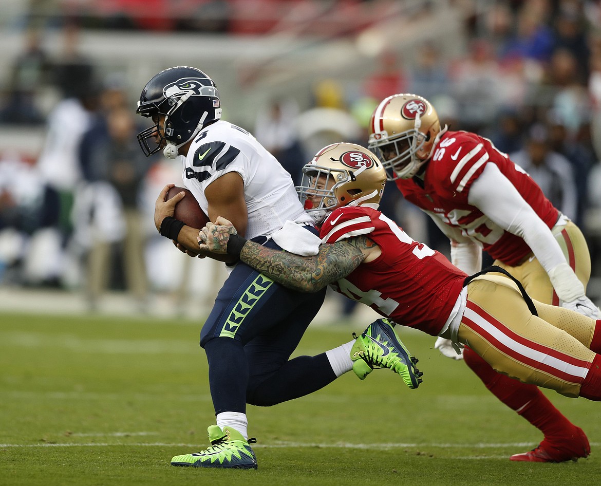 SANTA CLARA, Calif. (AP) — Russell Wilson threw for two touchdowns to give him 150 career TDs passing and also ran for a short score, and the Seattle Seahawks overcame a sloppy start to beat the San Francisco 49ers 24-13 on Sunday.