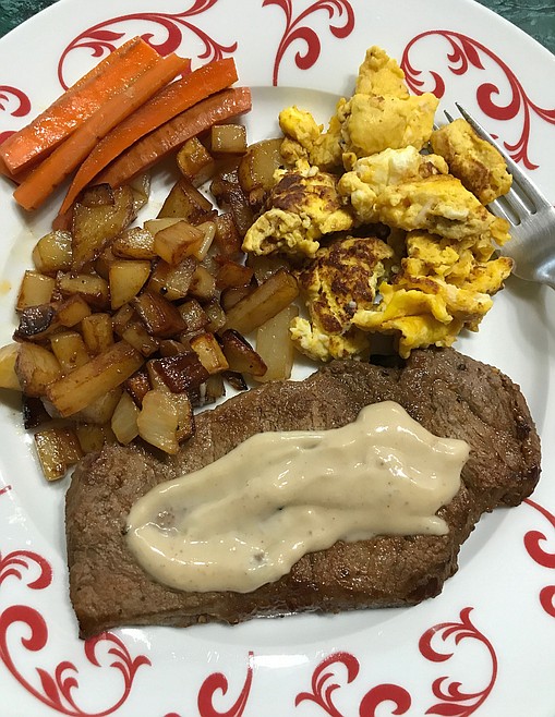 Now it was time to plate the food. Not everyone serves their steak and eggs with just gravy, so I had ketchup and hot sauce available. The steaks should be served within a few minutes of finishing. Cold steak is best for leftovers.