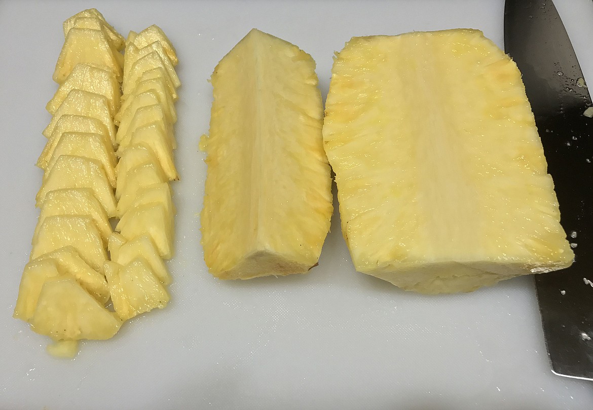 Steady the pineapple in an upright position, slice down the sides, cutting off not just the tough outer skin but also the inner spikes. Don’t worry if you don’t get all the dark stuff trimmed off in the first slice. Keep doing this all around the pineapple, following the natural contour. Once all the skin has been removed, you can now slice as desired.