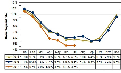 The unemployment rate for July was 4.7 percent, down from 6.1 percent in July 2016. That’s the same as the unemployment rate for June. It’s also the lowest unemployment rate in Grant County since electronic recordkeeping was implemented in 1990, wrote Don Meseck, regional labor economist for the Washington Employment Security Department.