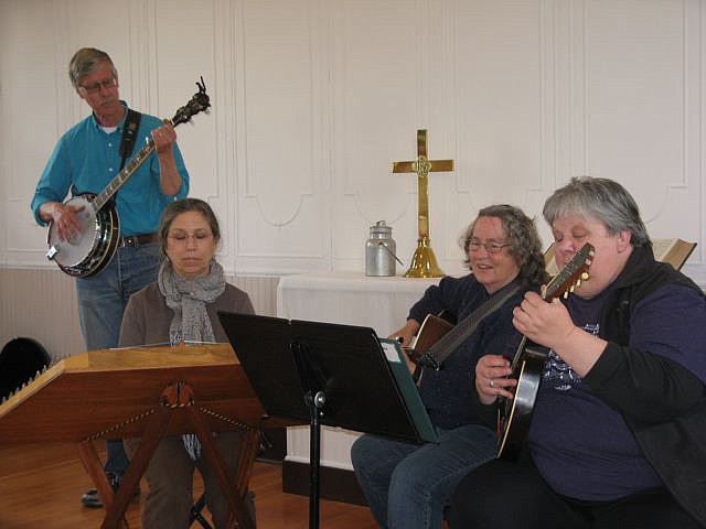 About 100 people packed the Pioneer Church for the event, according to Weber. The main entertainment was an Americana-themed concert by the Wenatchee-based group All Strings Considered playing hammer dulcimer, fiddle and guitar and joined by George resident Elliot Kooy on the banjo. The church’s superior acoustics owing to its unique barrel vault ceiling made the music especially beautiful, Weber said.