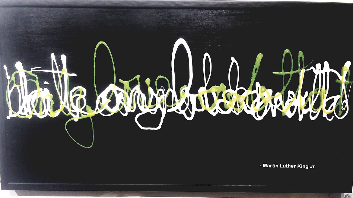 Robert, who has a background in fine art and art history, has a number of pieces on display. Most are of “word feelings,” a chaotic rendering of a famous quote layered on top of itself, creating a wild image he describes as a rising cityscape. A style he first developed twenty years ago while layering the first verse of the Bible, Robert said it’s just one of the many eclectic forms he’s been drawn to by curiosity and serendipity.