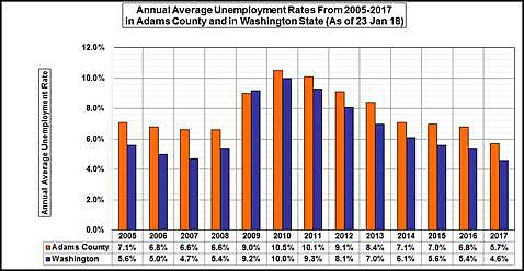 The unemployment rate was 7.8 percent in December 2017, down from 9.5 percent in December 2016. “Adams County’s annual average unemployment rate dipped from 6.8 percent to 5.7 percent in 2017, a one and one-tenth percentage point downturn,” wrote Don Meseck, regional labor economist for the Washington Department of Employment Security.