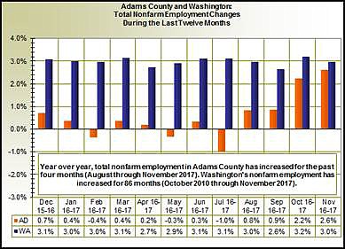 “Year over year, total nonfarm employment in Adams County increased for the past four months, August through November 2017,” wrote Don Meseck, regional labor economist for the Washington Department of Employment Security. “In November 2017, total nonfarm employment (in the county) was 5,900, up by 2.6 percent and 150 jobs from the 5,750 jobs tallied in November 2016.”