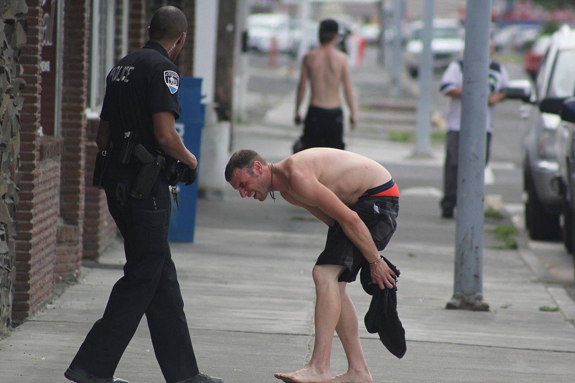 Officers helped the man out of his cuffs, which they described as “the real deal,” and assisted him with getting water to rub his eyes out. Though he had arrived to the Herald’s offices fully clothed, the man’s shirt had by now been cut along the back for use as a rag.