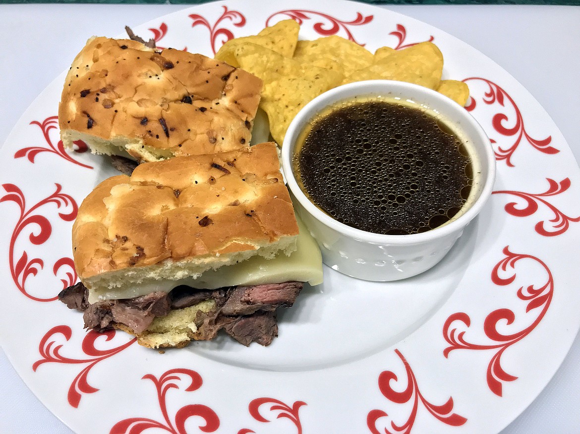 I’ve always been partial to a French dip sandwich. The toasty bread piled high with perfectly cooked meat, sometimes topped with a slice of melted Swiss cheese. Trouble is, not everyone does it well, or the same way. I recall one place serving theirs on a chunk of a rustic baguette. You had to dip it into the jus to be able to sink your teeth into it. There was the place that cooked their own meat, but it was so overcooked that the shreds they served on the bun were chalky dry; the jus they served was the actual juice from the cooking pan, which was mighty tasty. Some places use deli sliced roast beef. The place that served it on the baguette mentioned above scorched it to death on a flat-top grill. It should have been there just long enough to heat through. Another place dipped the serving of beef into a pot of jus to warm it up before placing it on the bread.