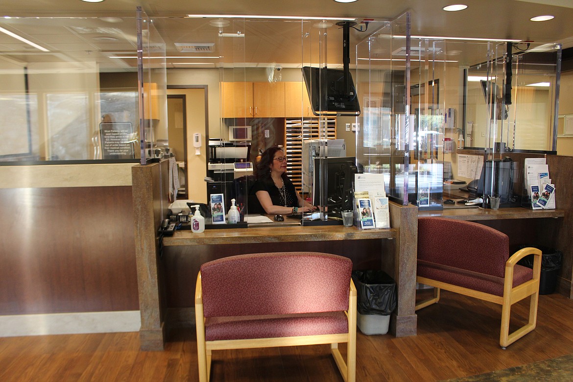 The admitting area is encased in glass and has room for two patients to be interviewed at a time. The glass is a security measure – it’s bulletproof – and it helps reduce sound transfer, which enhances patient privacy.