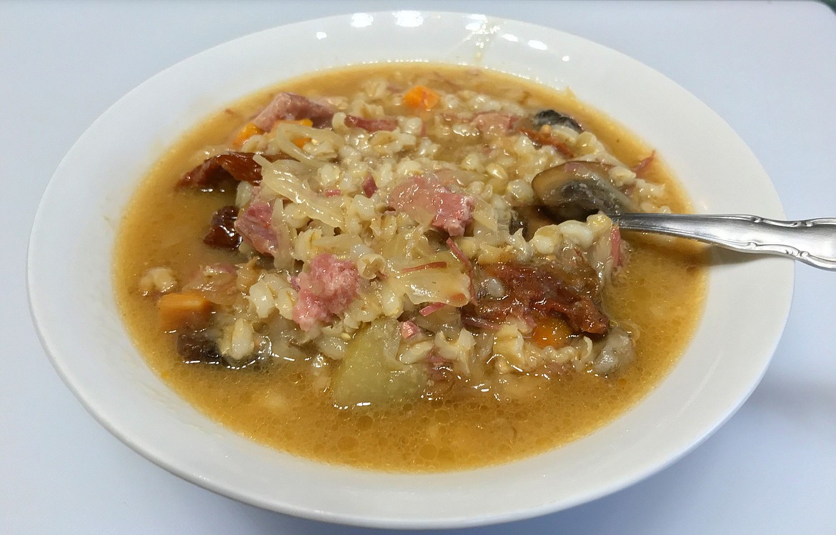 My mom always makes sauerkraut soup for Christmas. It's a delicious combination of sauerkraut, kielbasa, barley, and some background ingredients. While good on the day of making up the batch, it was best served on the second day, after a period of refrigeration. This allows the flavors to mingle in ways you wouldn't otherwise get. Mom's recipe is actually very easy to make up. Dump it all in a pot, heat and serve. The batch I made up in the picture was made in a more traditional way, in that I browned the mushrooms well in butter before adding a mix of carrots, celery, and onions. I browned those as well before adding the remaining ingredients. Instead of the kielbasa, I had some leftover corned beef, which I cut carefully into small pieces and then stirred in. Heresy, you say? After all the corned beef I ate this season I was glad to try something a little different, but it still tasted close enough to the traditional recipe as to be a good substitution.