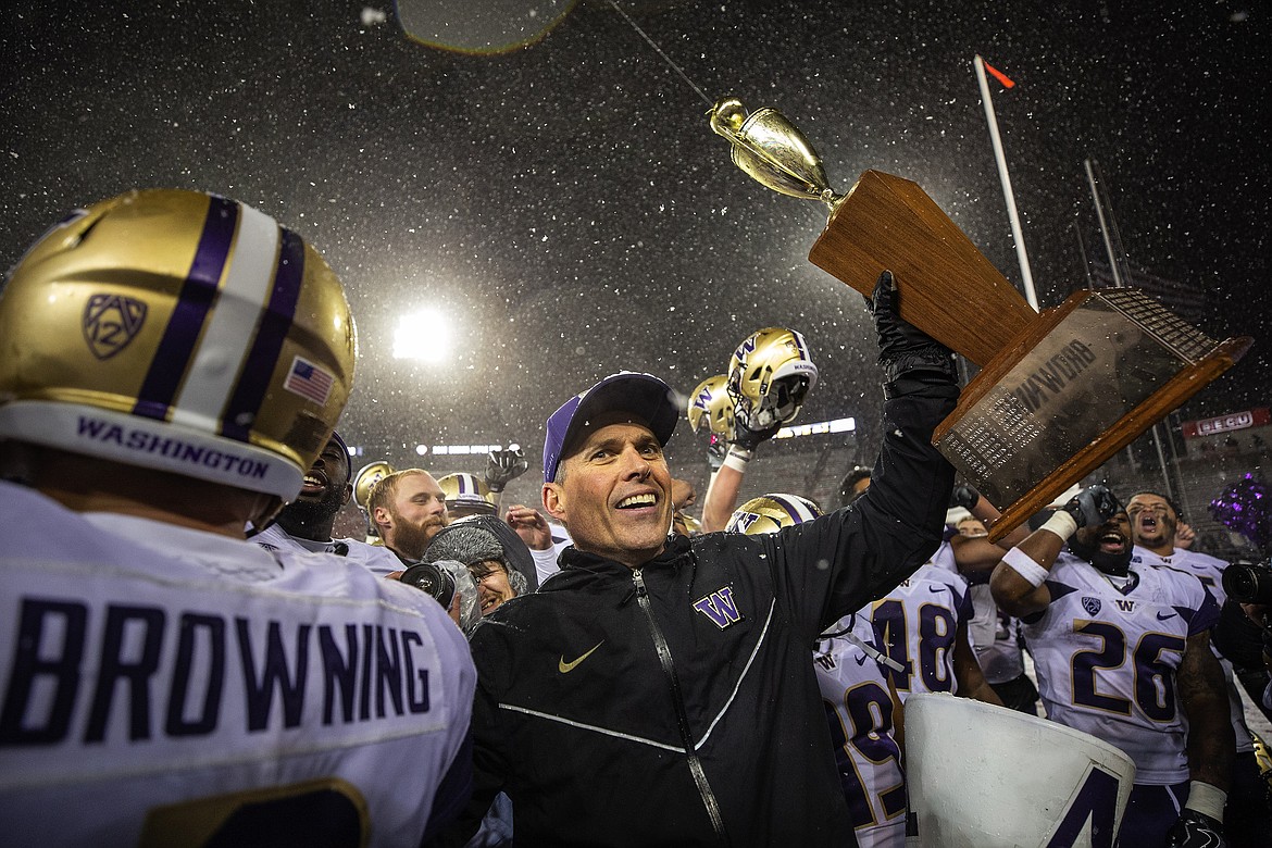There was plenty of celebrating by Washington’s coach and his players — snow angels, snowball fights — after the Huskies continued their dominance over Washington State in an Apple Cup the purple and gold won’t soon forget.