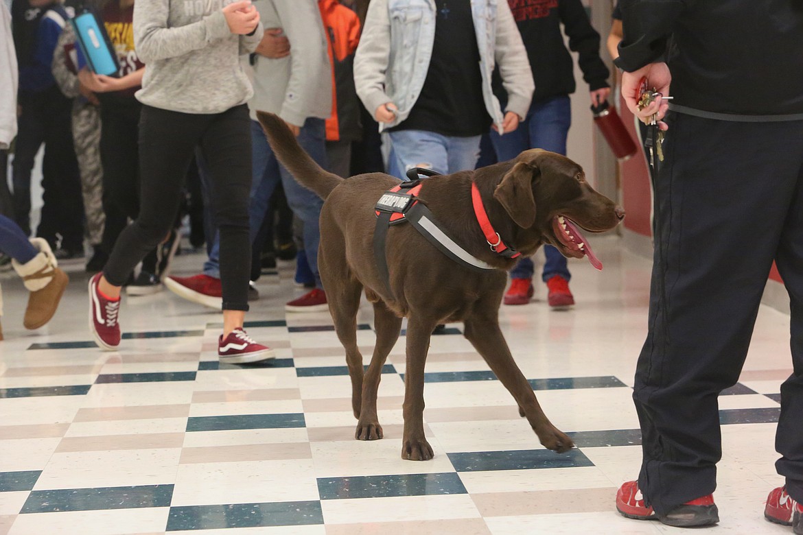 MOSES LAKE — Amid the din and mild chaos of over a hundred young students chatting during the first lunch period at Chief Moses Middle School, the youngest professional at the school walks past a school resource officer, sniffs the air, and begins strolling between the aisles.