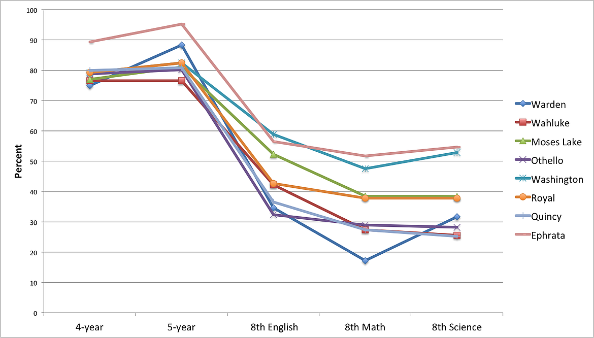 In every other district but Ephrata, scores were below average, generally ranging from Moses Lake School District at the top and Warden at the bottom. For instance, Moses Lake School District students passed eighth-grade math testing 9 percent less often than the average student in the state; Warden School District students given the same test passed more than 30 percent less often than the average Washingtonian student.