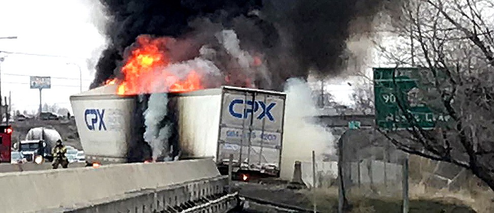 The accident, reported to the Washington State Patrol around 1:30 p.m. Saturday, involved a 2018 Volvo tractor and trailer, driven by Matthew Pabon, 26, of Surrey, British Columbia, striking a guardrail on I-90 near the Half-Sun Travel Plaza exit in Moses Lake. The semi went on to strike a concrete barrier, which caused the rear axle of the tractor and the two axles on the trailer to become dislodged. The frames came to a rest on the deck of the eastbound I-90 bridge, while the tractor and trailer continued across the bridge until it jackknifed and caught on fire.