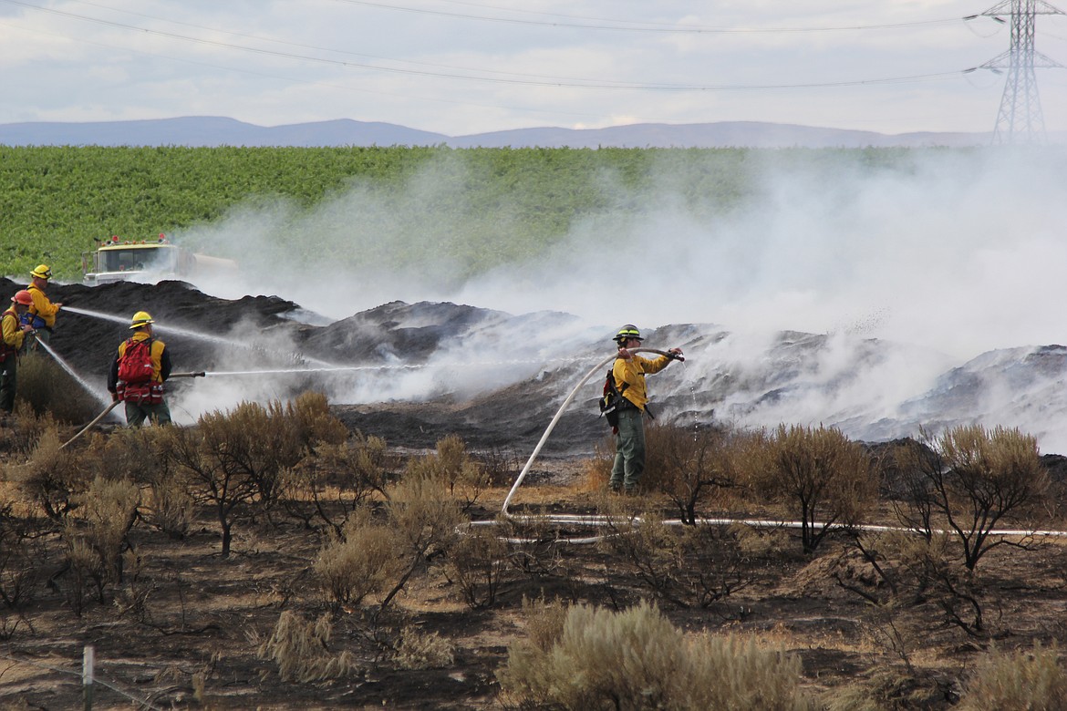 Around a dozen firefighters from various agencies tended to a mound of grape husks drying in a field along the northern bank of a canal, one of the last large piles of smoldering material, and other teams took shovels to the scorched remains of scrub brush.