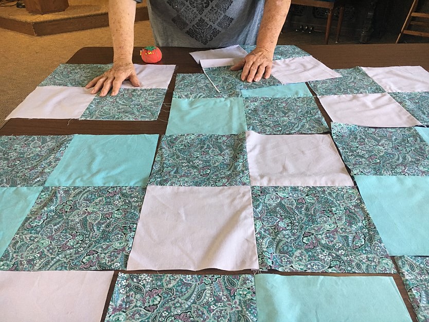 The quilting group has been going on for many years. Over the years, an assembly line style process has been perfected. Some people, like Stevenson, cut squares. Some iron the fabric or match the fabric colors together. Others sew the squares together, while some tie the quilt fronts and backs together.