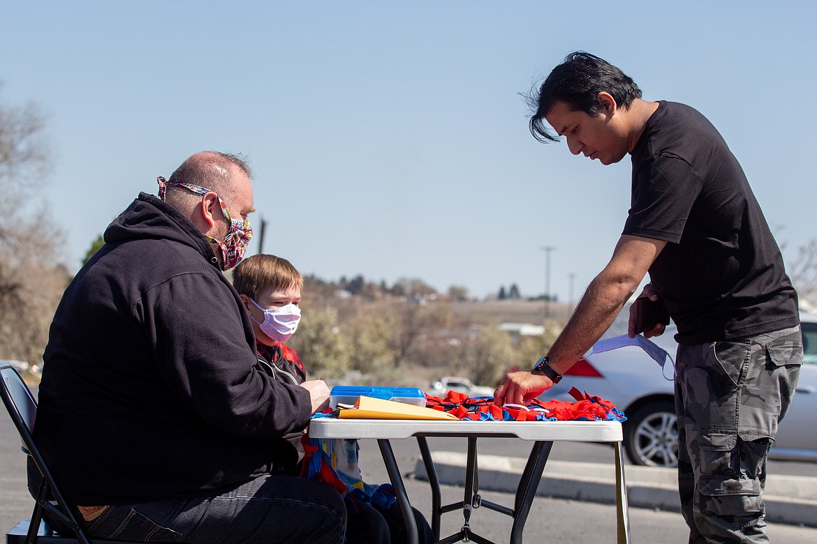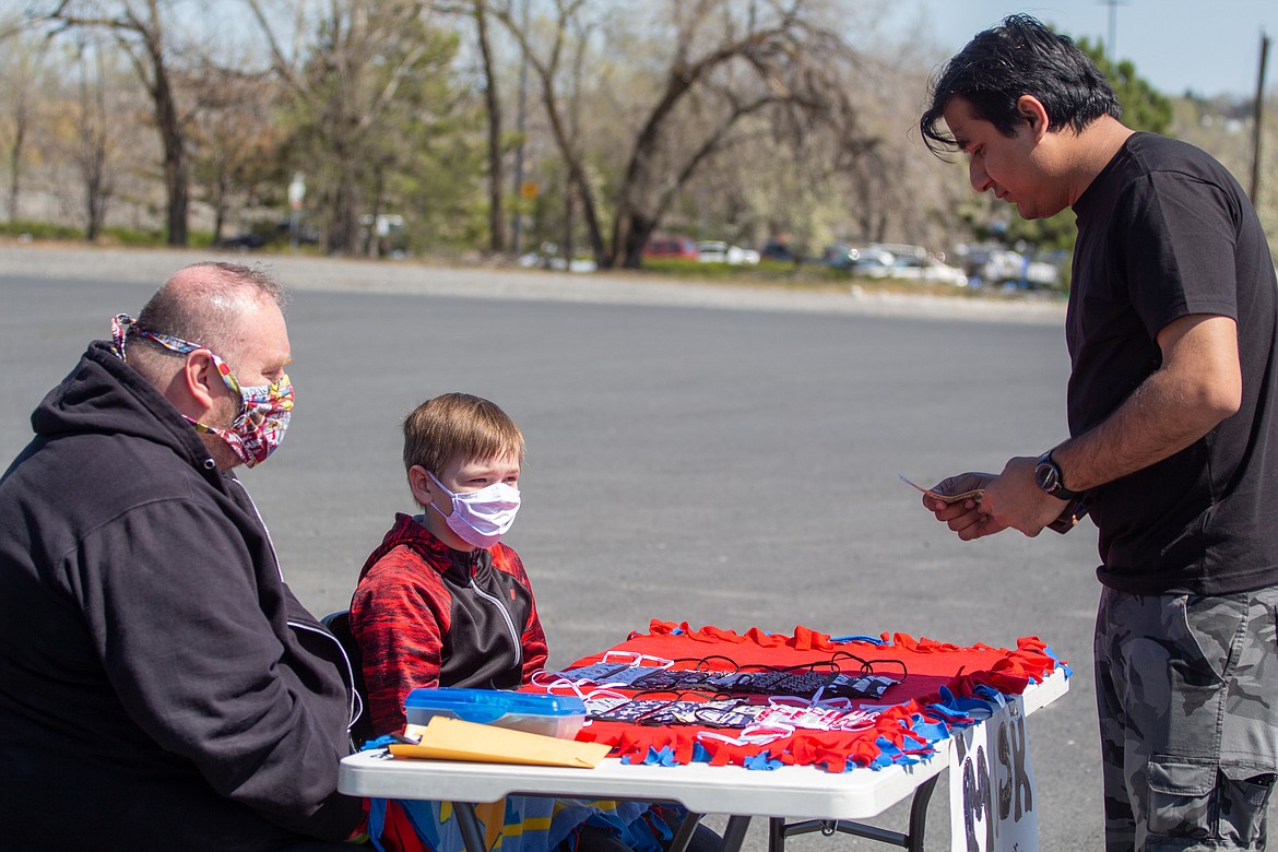 On Thursday, for the third day in a row, Jim and his son Carson had a table set up in Penn Plaza, in Moses Lake, selling masks. Jim, a Moses Lake resident, said his wife, Mary Ann, has been sewing masks for weeks and has made more than 200 masks. Having already donated masks for various family members and workplaces asking for them, they decided they might as well begin selling them. Joe said they have sold about 60 masks each day.