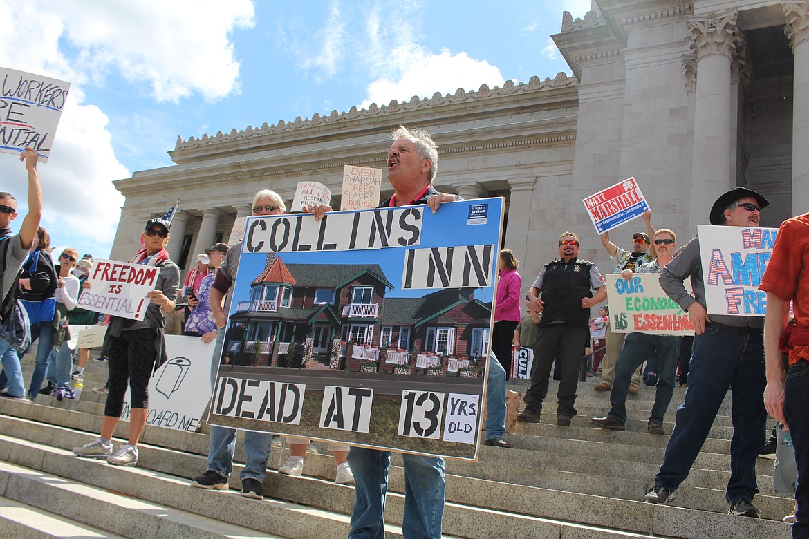 “This is the new death count right here,” Collins said as he stood next to the capitol with a large photo of his family’s inn.