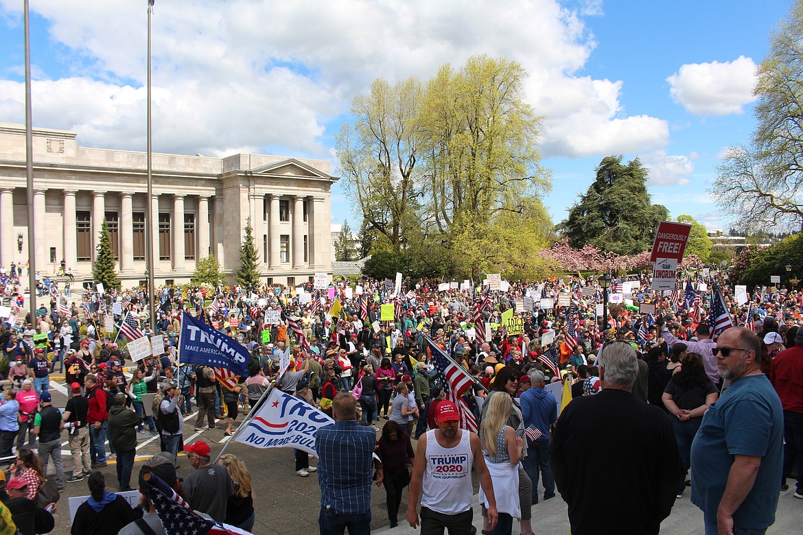Frustrated residents gathered from all over the state, bearing flags and signs to show disapproval of Inslee’s social distancing mandates, which have closed schools, prevented church meetings and caused skyrocketing unemployment.