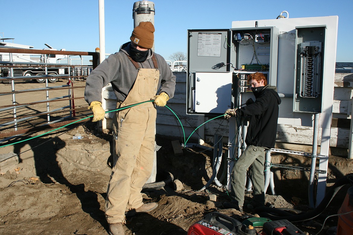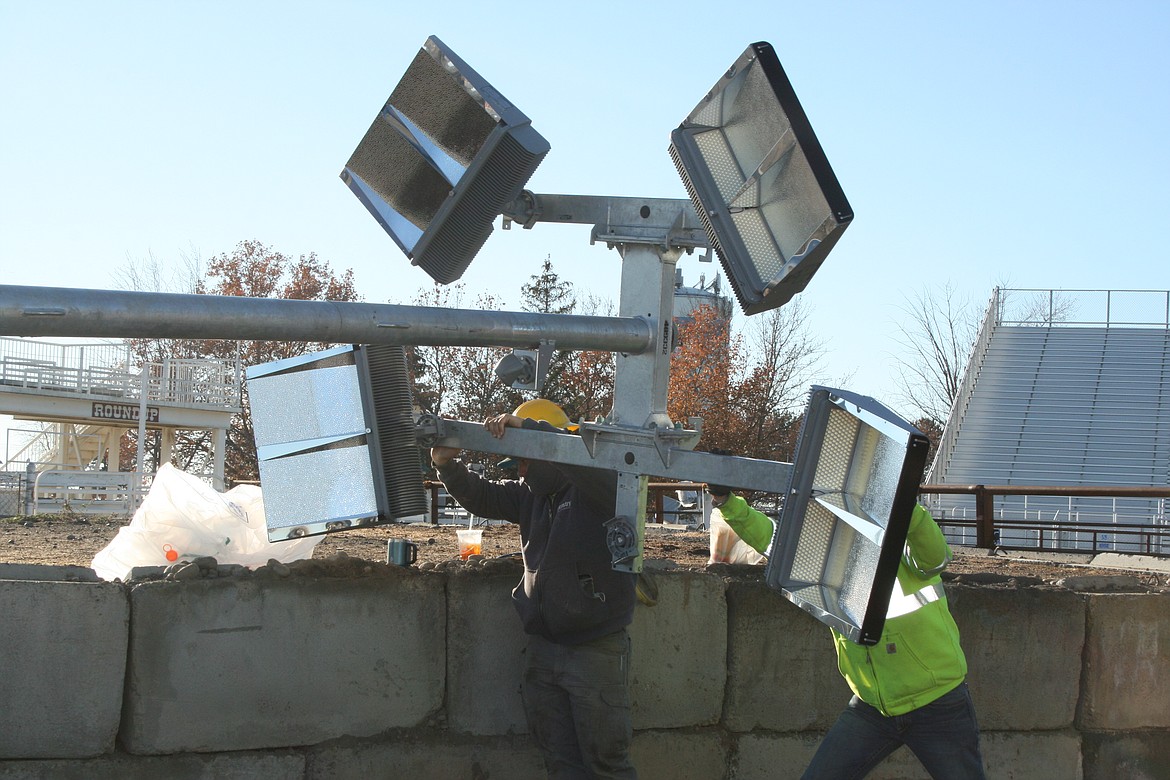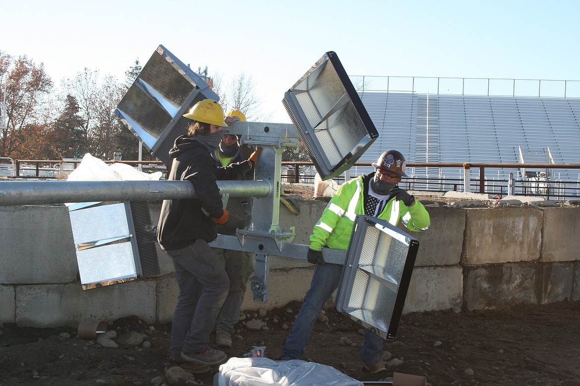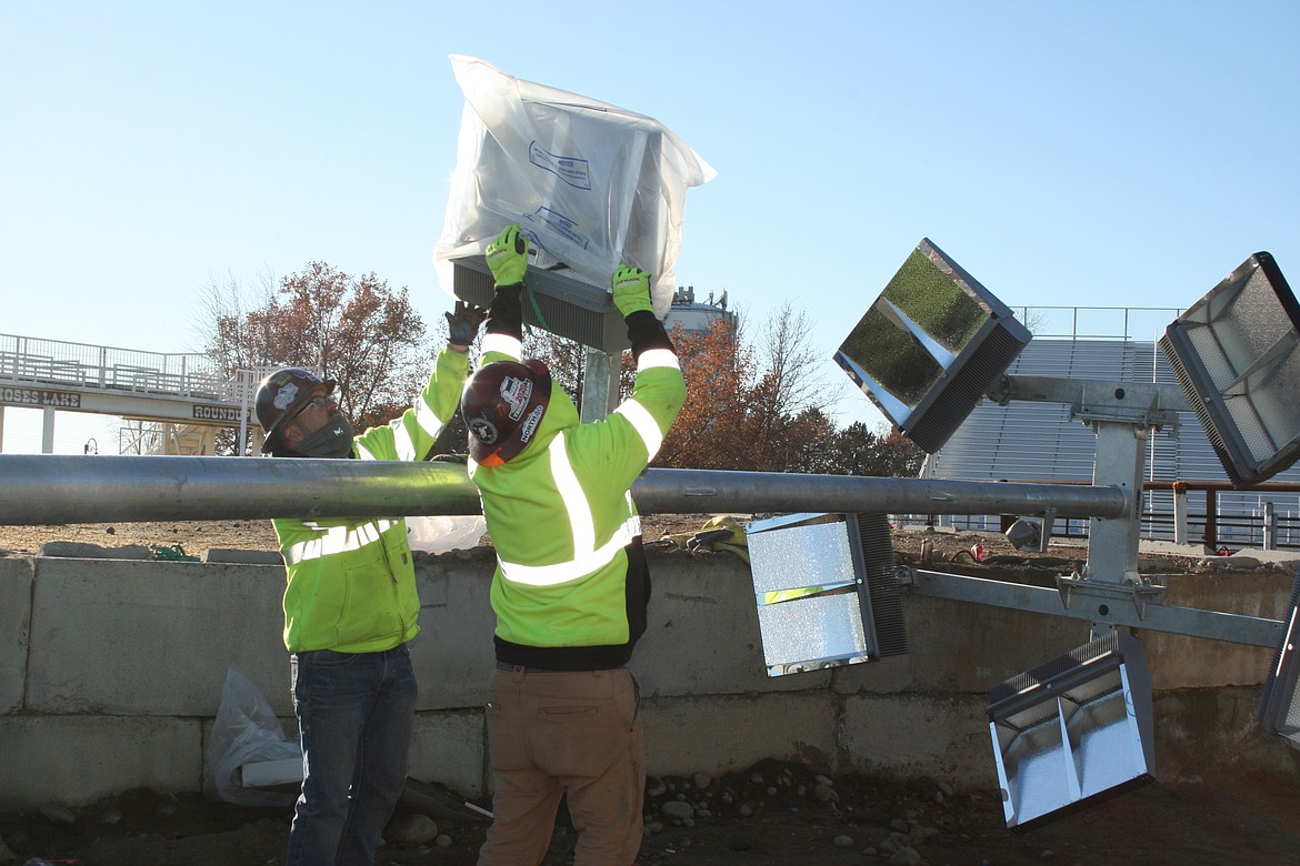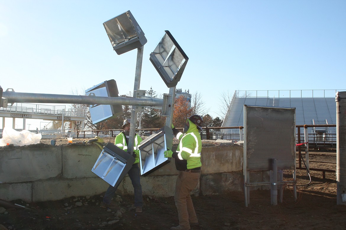 MOSES LAKE — The job of setting a 75-foot light pole on a seven-foot base, using a lift that extends 20 feet and a crane that extends 100 feet, is an inches game.