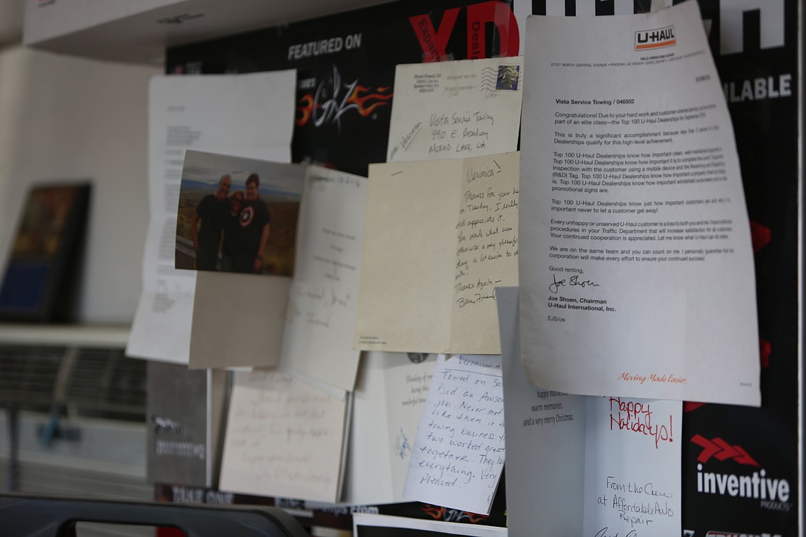 MOSES LAKE — On a wall near the front door of Vista Service Towing, nearly a dozen letters, postcards and printed emails have been hung up, almost all of which represent another family thanking the drivers that, at some point, had saved their day.