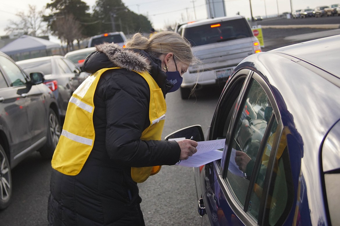 Commands and updates flowed through radios clipped to the waists of public health officials Saturday. Yellow-vested Samaritan staff and volunteers ran up and down the line of vehicles to check registration and insurance.