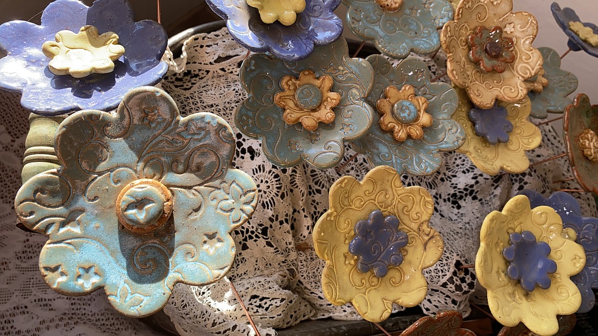 The Old Hotel show includes what Johansen called “functional pottery,” pieces like cookie jars and honey containers, batter bowls and dessert plates, among other items. There are some clay flowers in the show as well.