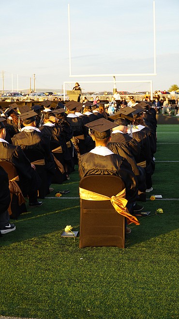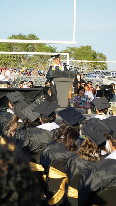 Royal High School teacher Jeremy Elliot addresses his students at graduation Friday.