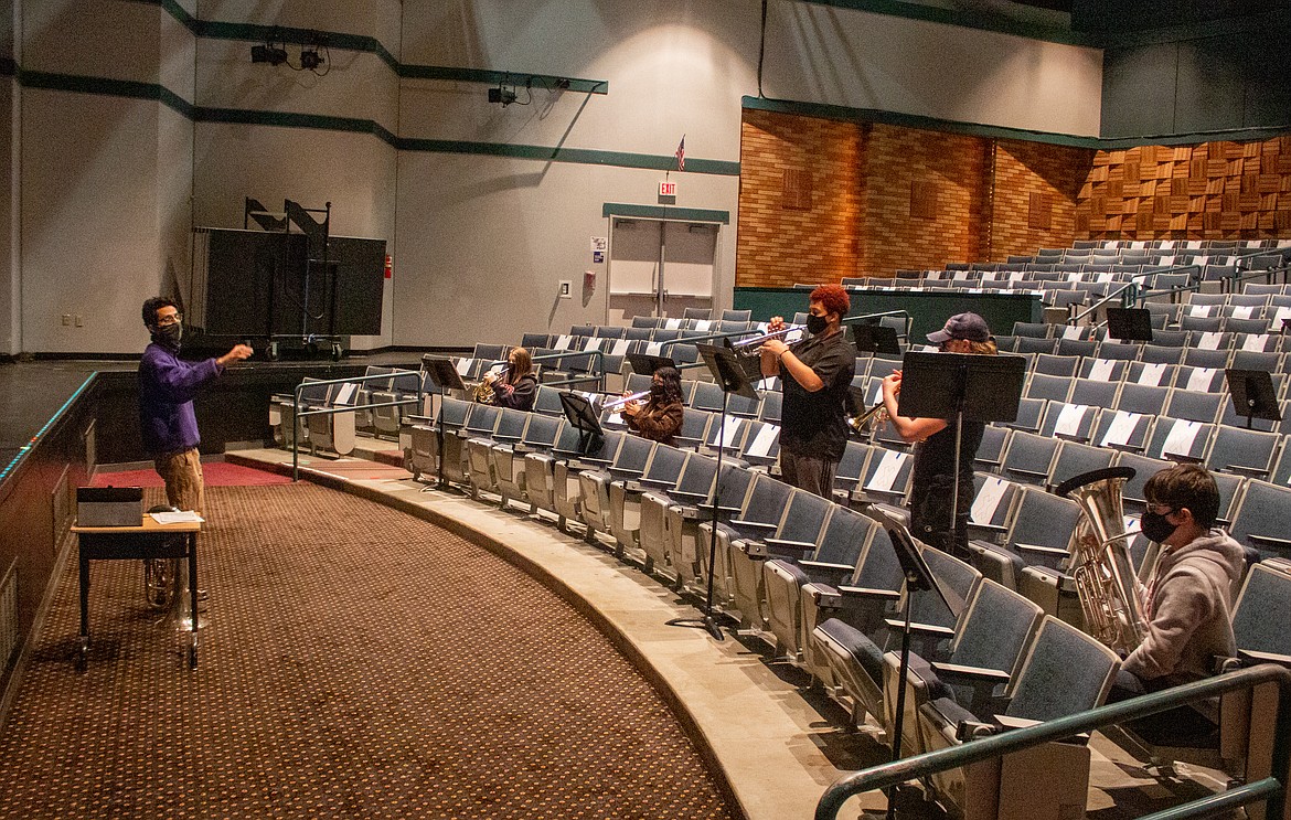 Setting up a time for students to practice together, with the student population broken up into two cohorts, has been a challenge. Beich said he wants to set up at least once or twice a week to meet outdoors for rehearsals.
