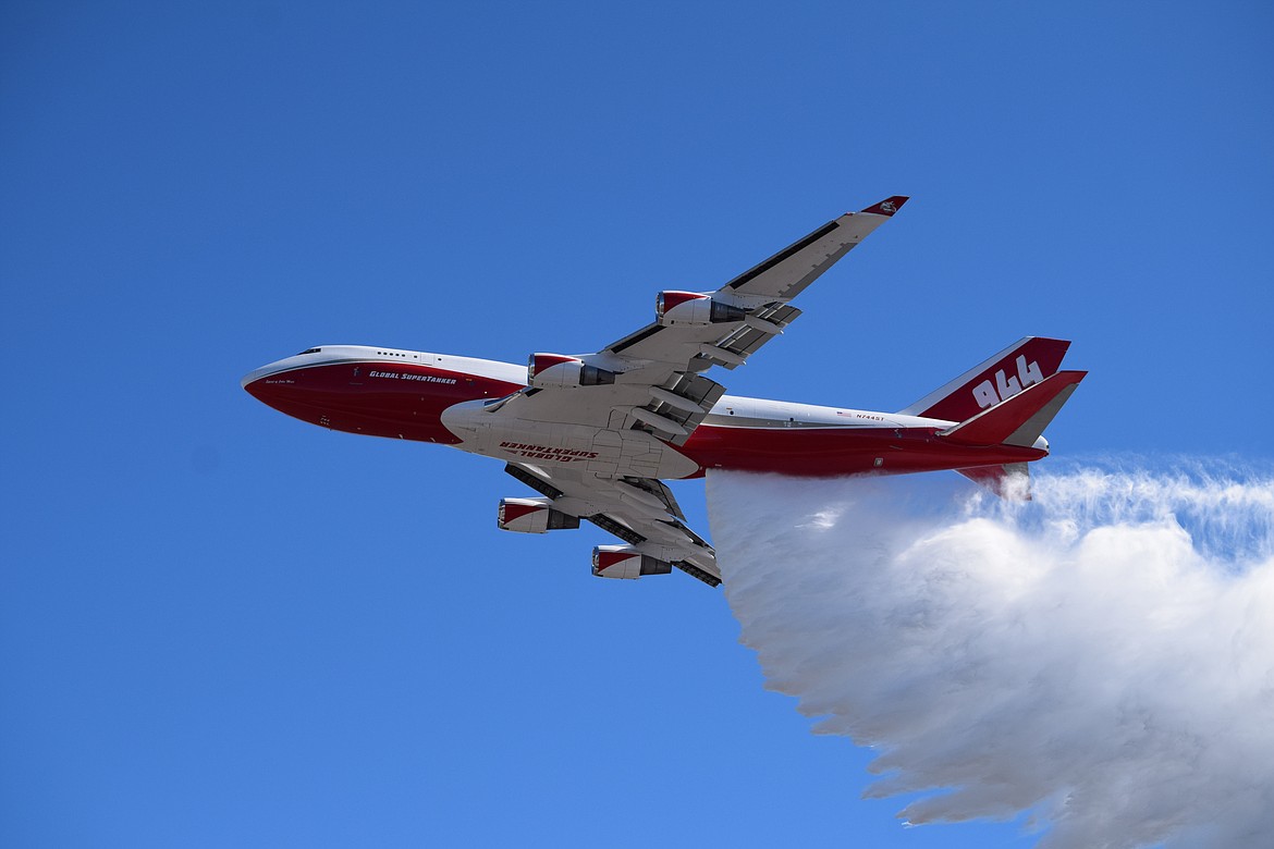 MOSES LAKE — It took a little bit more than 10 seconds for the world’s largest firefighting airplane to dump nearly 20,000 gallons on the main runway of the Grant County International Airport.