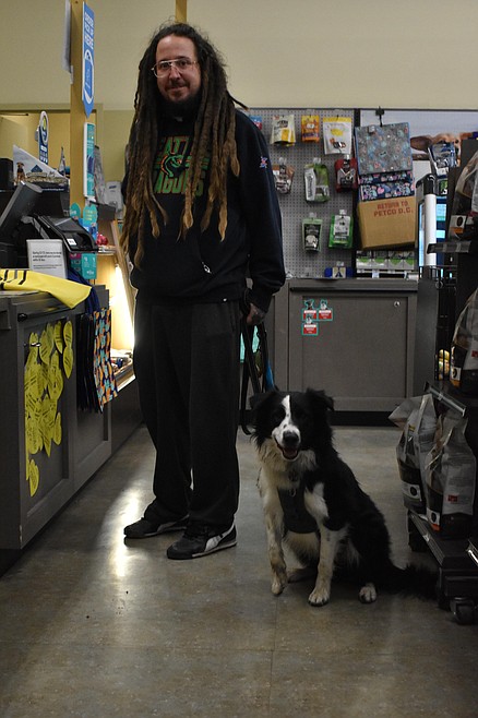Tyler Scott poses with his dog, Wilson, while checking out at Petco in Moses Lake on Wednesday. Scott bought Wilson a yellow raincoat on the rainy, gloomy afternoon. Scott said Wilson was named after Seahawks quarterback Russell Wilson. Wilson, the dog, has a brother called Russell, named in the same fashion, according to Scott.