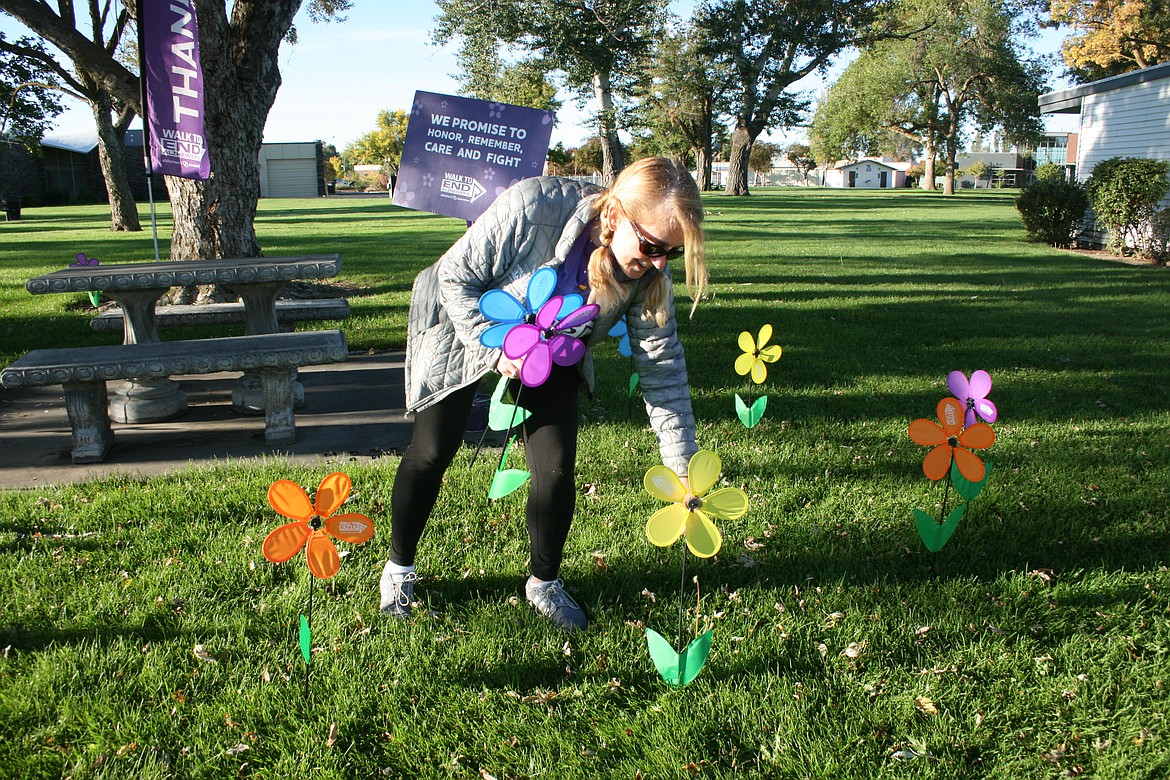 Participants walk 1.5 miles down Pioneer Way and loop back to MLHS. Walkers carry flower-petal pinwheels in different colors, signifying how they have been affected by the disease.