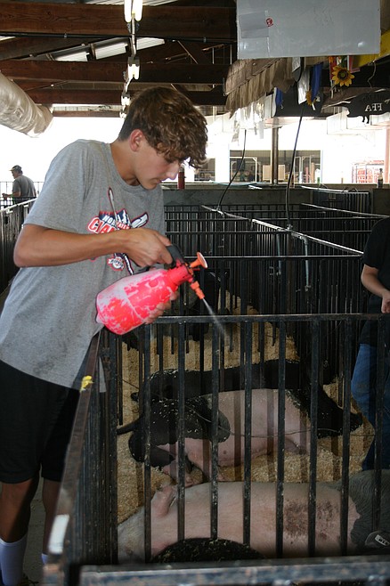 MOSES LAKE — The swine barn at the Grant County Fair is shady and relatively cool compared to outside, and the pigs were dozing in a pile of wood shavings. Nevertheless, the pig was starting to huff and puff.