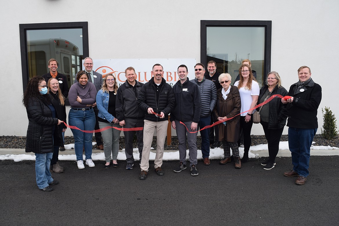 Physical therapist Steve Roylance, flanked by Columbia Physical Therapy co-owners David Jensen, left, and Kevin Hodgson, right, and clinic aide Serenity Franz (purple sweater), office manager Lindsey Rosenow (blue jacket) and Rachel Nichols (white shirt, to the right), as well as members of the Moses Lake Chamber of Commerce, cuts the ribbon on his new business location at 1800 S. Clover Drive – not far from Moses Lake High School — in a small ceremony on Wednesday.