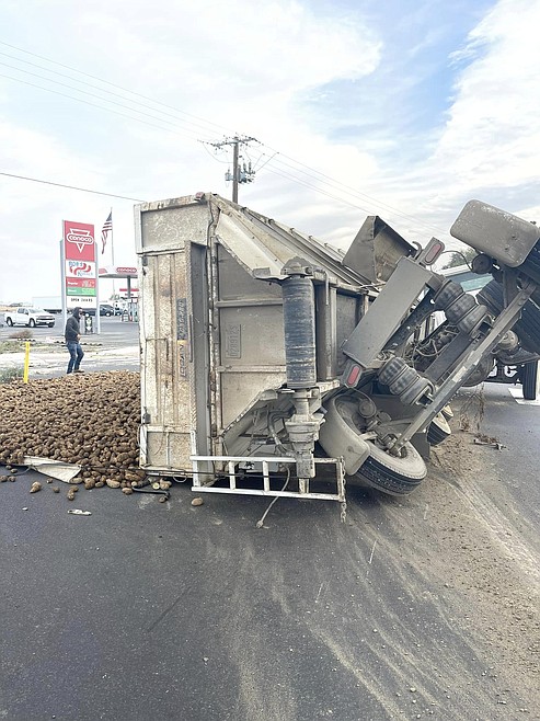 OTHELLO — A major intersection on S.R. 24 south of Othello was blocked for several hours on Thursday after a potato truck overturned while traversing the roundabout with Bench Road and spilled its load of potatoes.