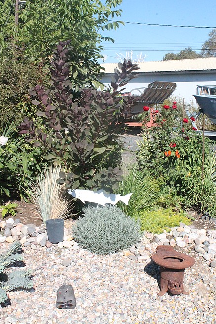 The rockery in Fields’ front yard is, well, eclectic may be the right word. There’s a boat propeller, several little sculptures, an anchor and a large “F” made of gambion and filled with Japanese glass fishing floats.