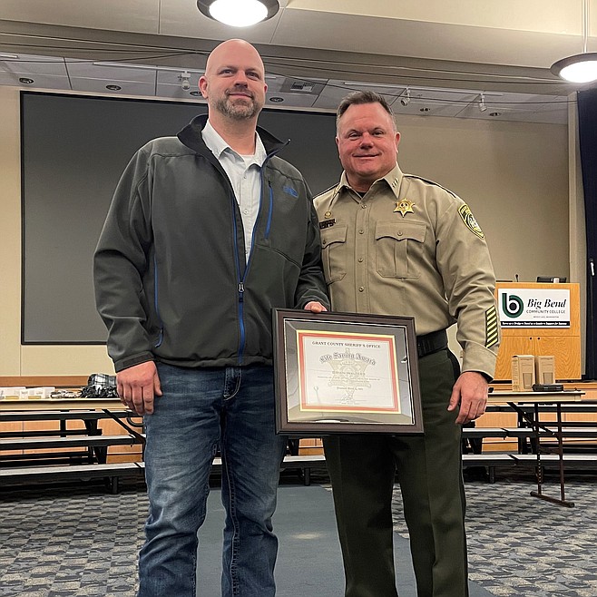 EPHRATA – Grant County Sheriff Joe Kriete, right, presents the 2023 Life Saving Award to Brian Walters of Grand Coulee, a UPS driver who helped save the life of a 7-year-old drowning victim in July 2022. Walters, who is also a volunteer firefighter, pulled the child, who wasn’t breathing, out of a pool at Smokiam Resort in Soap Lake. Walters performed CPR on the girl until she was revived.