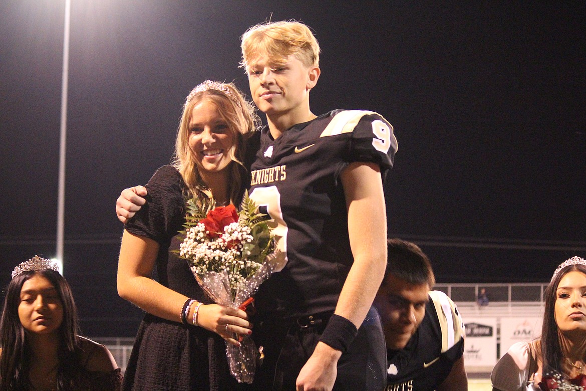 ROYAL CITY — Megan Fielding, left, and Case Christensen, right, were selected as queen and king at Royal High School’s Homecoming game Friday. The Knights won the game 55-0 over Kiona-Benton.